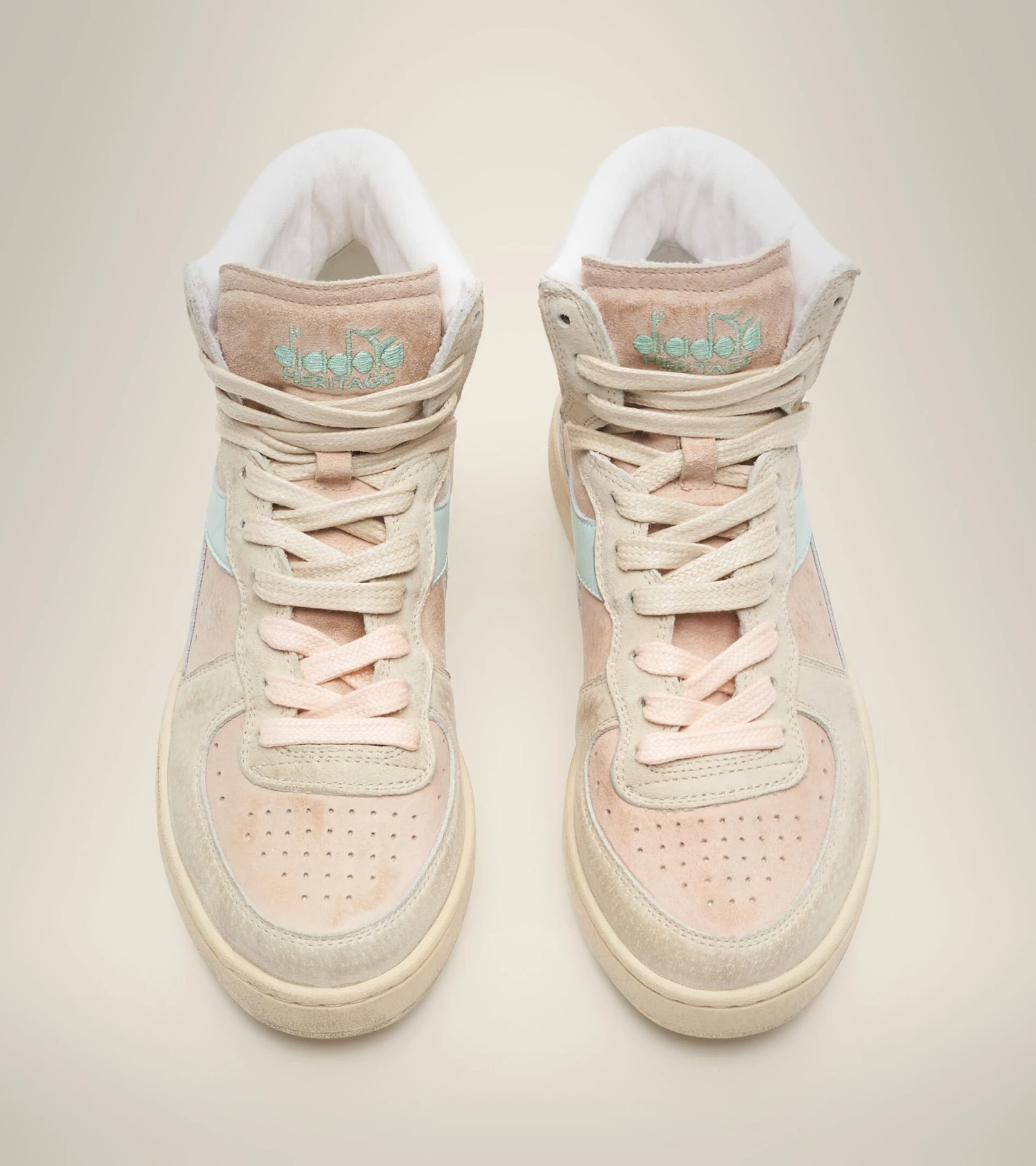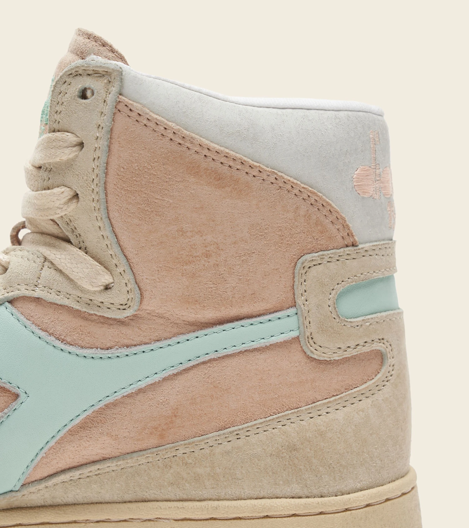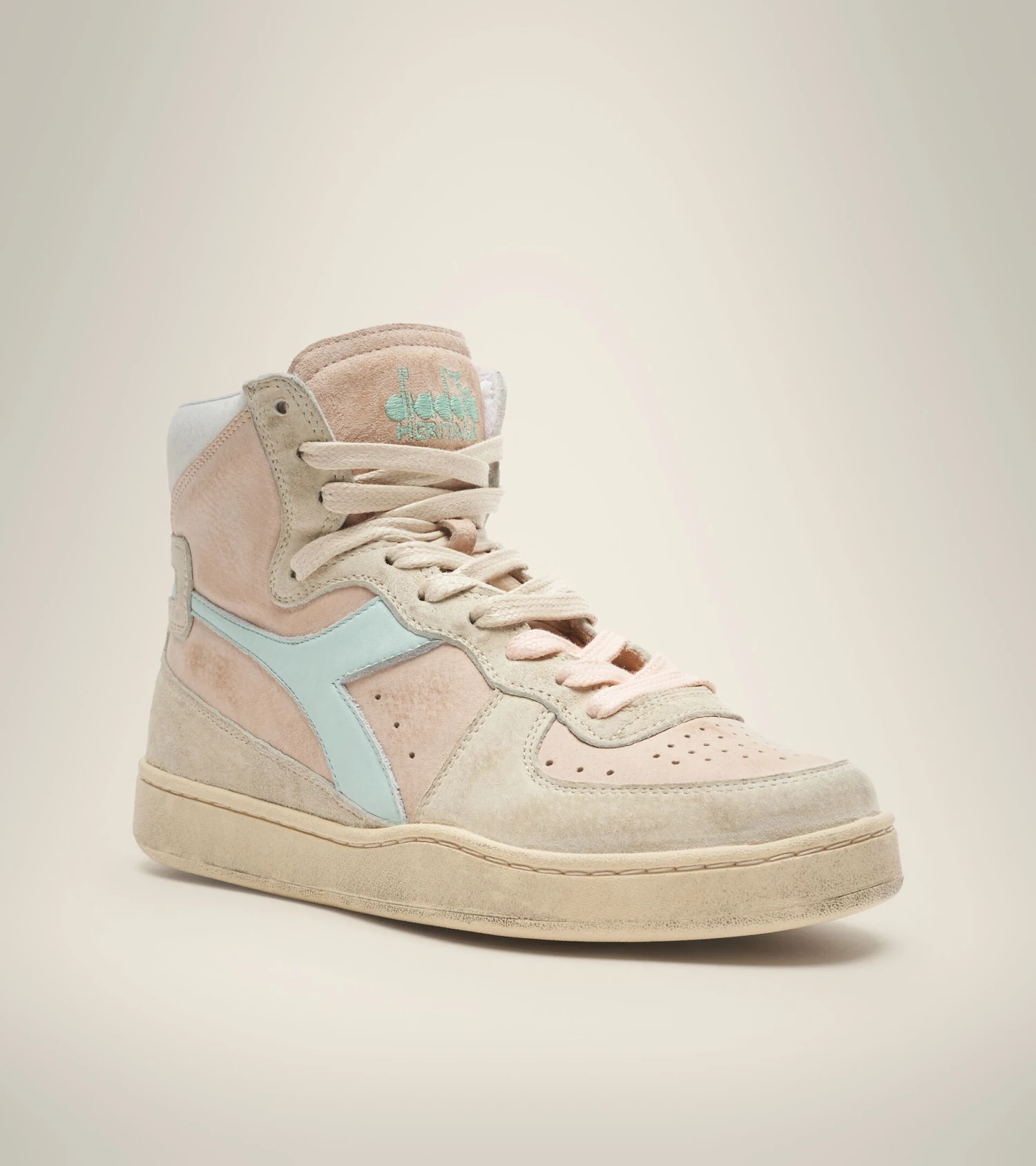 The Diadora Heritage Mi Basket Pigskin Used is one of our iconic styles that comes with a light blue fregio in this version, paired with pale colours in pigskin with a stonewash treatment.