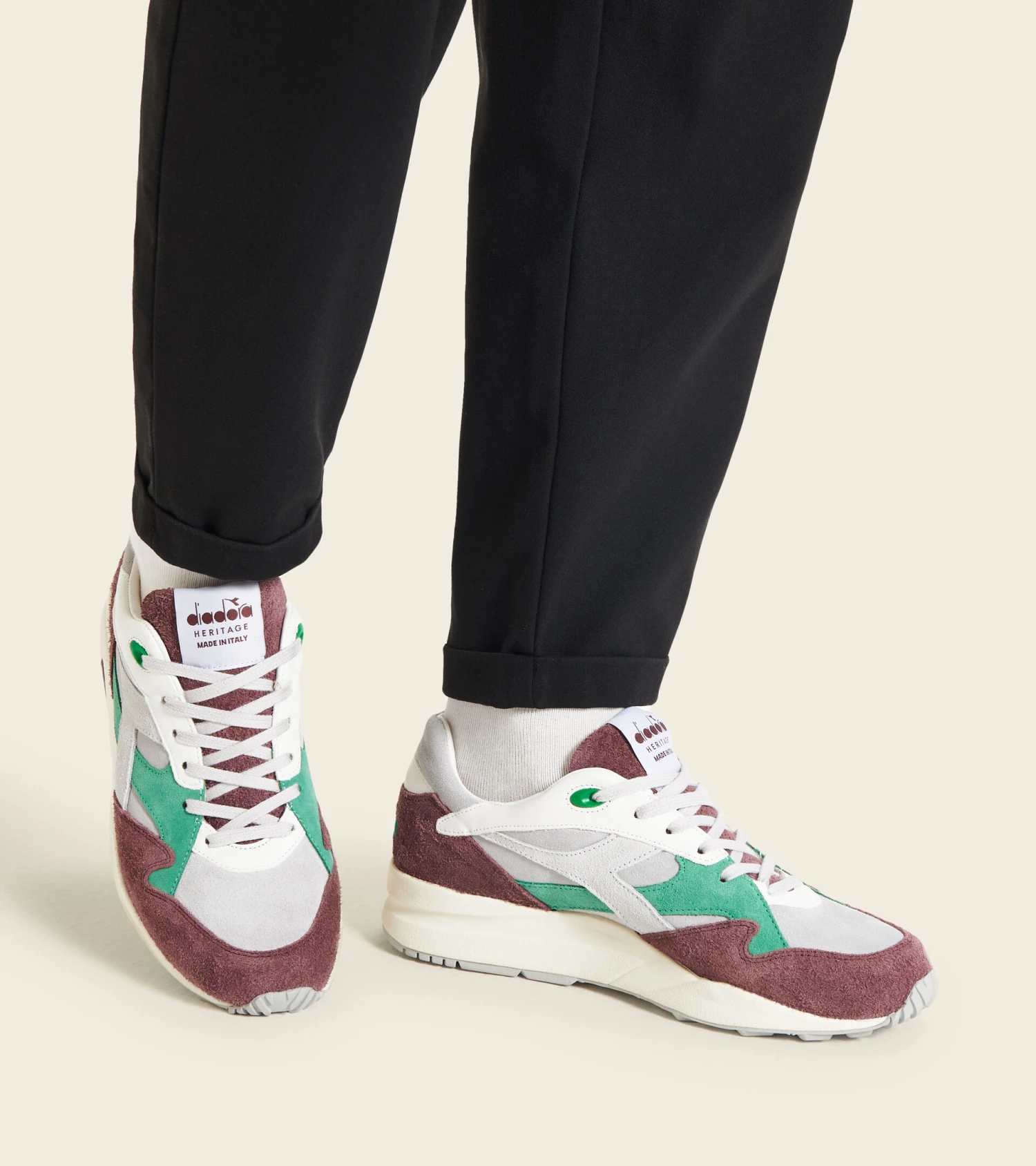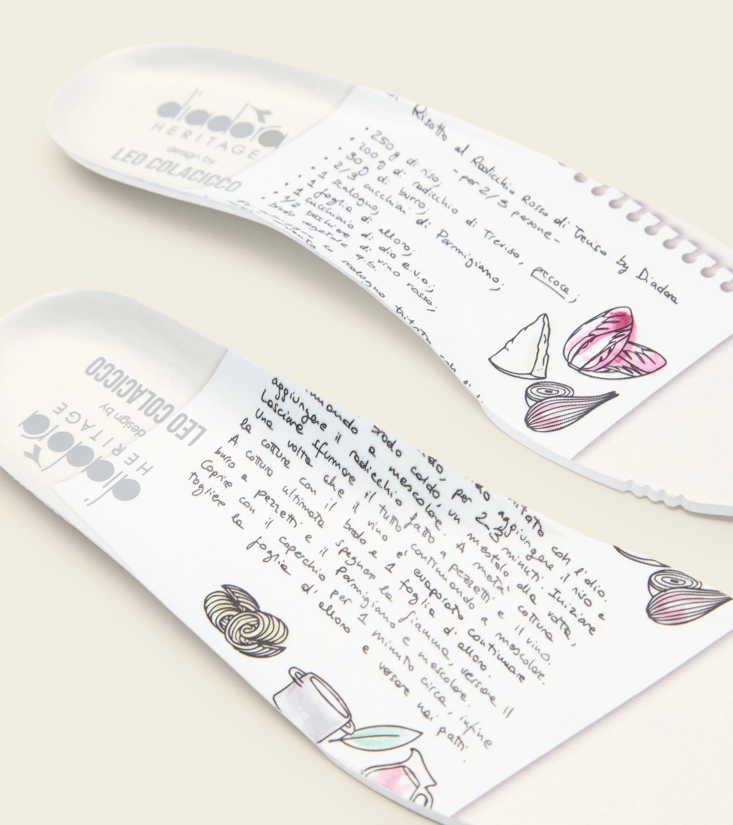 Como especialidad italiana presentamos el pack Made in Italy, realizado en colaboración con Leo Colacicco, que homenajea el legendario arte culinario italiano a través de algunas zapatillas emblemáticas diadora. Hecho en Italia detalles en piel prémium en colaboración con Leo Colacicco Eclipse Italia Radicchio es la zapatilla Made in Italy unisex realizada en piel de ante, terciopelo y con detalles en piel prémium. En la suela interna se describe la receta del ”risotto al radicchio rosso”, plato fuerte de Treviso, tierra de origen de diadora.