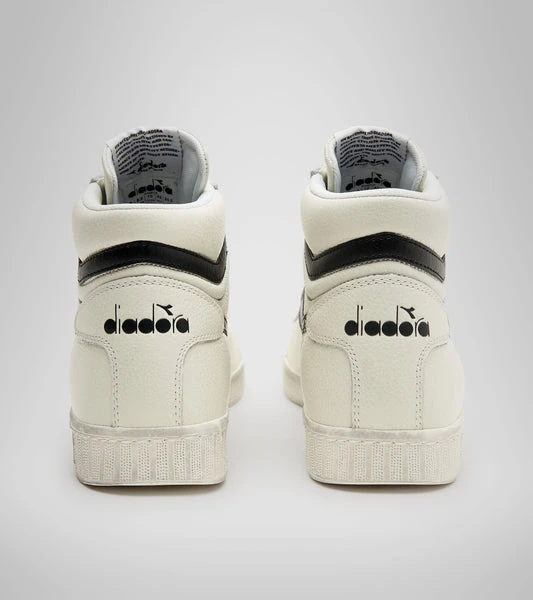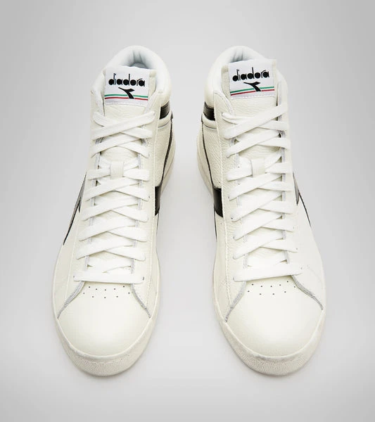 DIADORA GAME L HIGH WAXED WHITE/BLACK The iconic Game L High style comes in premium leather with a waxed treatment. Like all diadora icons, this shoe flaunts a sporty aesthetic, yet timeless style that suits any use. Unisex style with contrasting 5 ball logo and fregio detail.