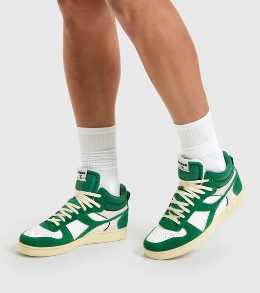 DIADORA MAGIC BASKET DEMI CUT SUEDE LEATHER AMAZON/WHITE An iconic trainer from diadora, the Magic is straight out of the basketball section of our 1985 catalogue. Created as the evolution of the Mi Basket, with a calfskin upper, shock-absorbing midsole and insole and special velcro strap on the high-top. This Magic Basket Demi Cut Suede Leather version comes in white and green leather and suede.