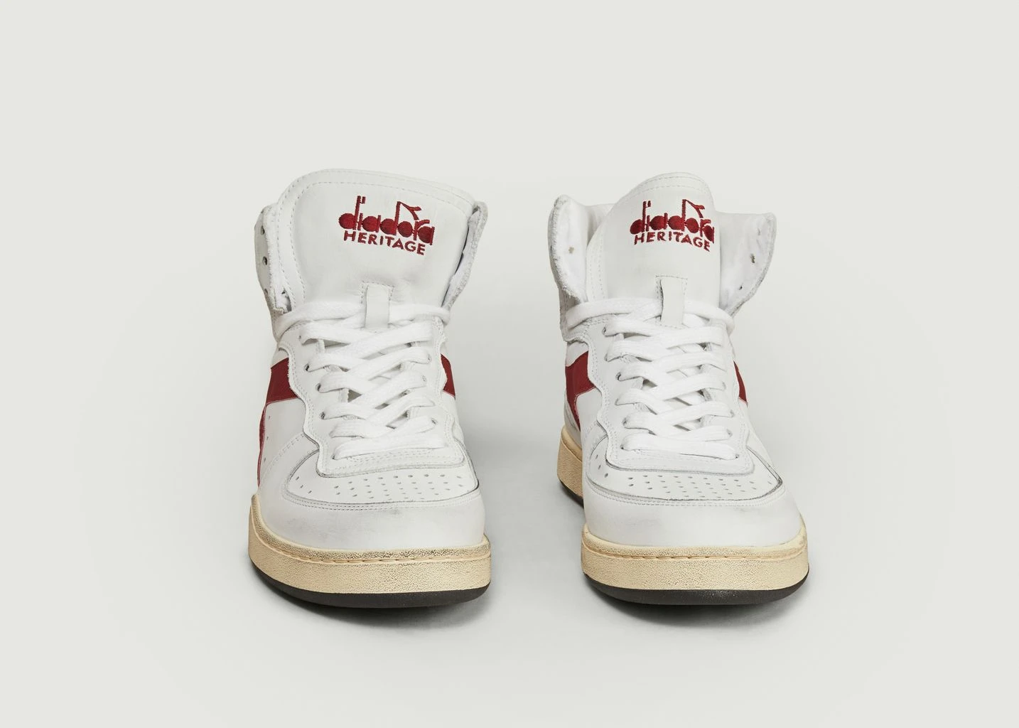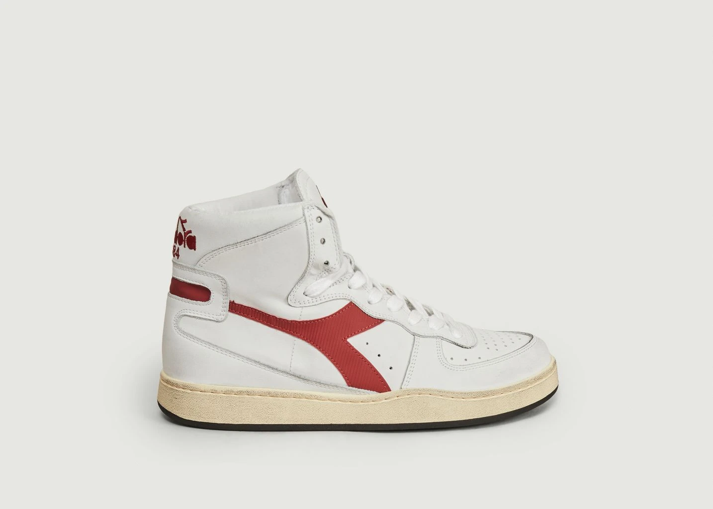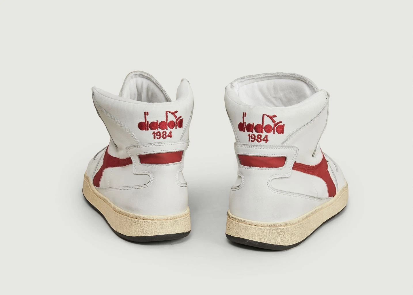 MI Used high top sneakers in full grain leather with stone washed treatment, white and red colour, aged effect, removable insole, midsole and rubber outsole. We love these Diadora Heritage sneakers for their stonewashed effect that gives character and a slightly retro look to the pair. Wear them with jeans and a t-shirt for a decidedly vintage and casual look.