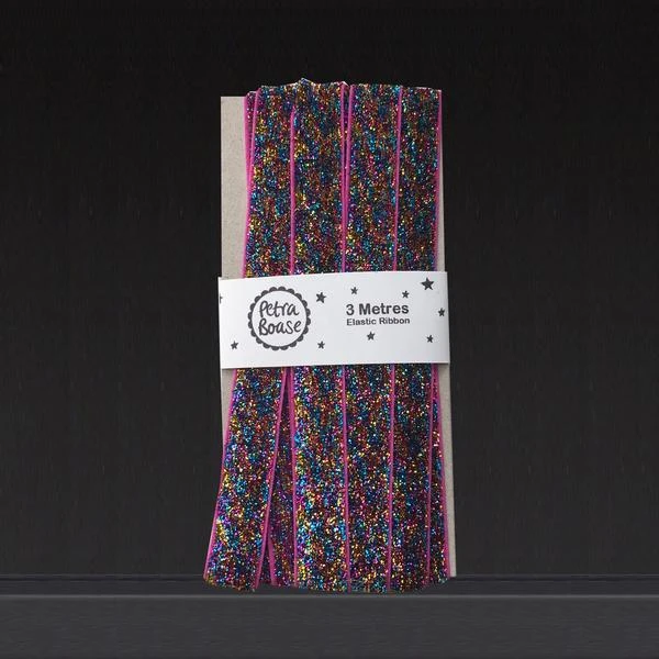 Glitter Elastic Ribbon individually packed on card in a cellophane bag. Ribbon Width: 15mm Ribbon Length: 3m