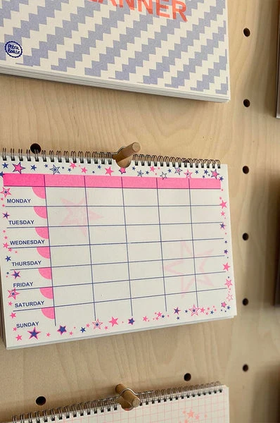 This is a neon popping weekly planner that will keep you super organised. Fill in the month, dates and names across the headers to modify it perfectly to your needs. Great for keeping your family organised, for student house rotas or as a study and work planner. Wire spiral bound spine with a hanging loop. 26 pages printed both sides so 52 weeks in total to fill in. Printed on a risograph printer using soy based inks on FSC certified paper by the lovely folks at Petra Boase. Please note that the accents of fluorescent colours may not show up clearly in the photograph. A4
