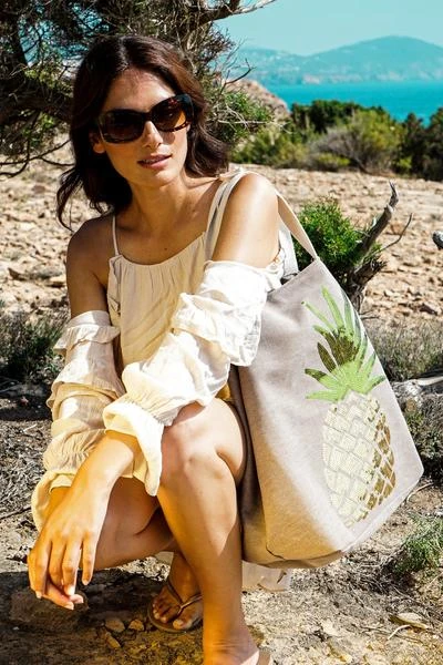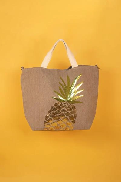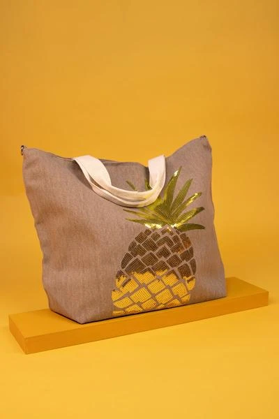 Powder Pineapple boho canvas tote bag. With a super sparkly sequin pineapple motif this bag is a must have beach essential with its handy clasp top helping to keep your belongings nice and safe on the shore! Why not pack it for a day at the beach or perhaps a day out shopping? The perfect summer bag wherever your’e holidaying. Measurement: Length – 56cm Depth – 43cm Width – 20cmFabric: External: 70% Cotton, 30% Polyester, Internal: 100% Polyester, Handle: 70% cotton, 30% polyester”