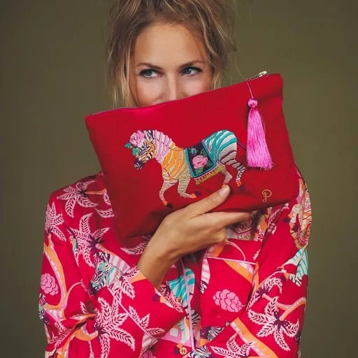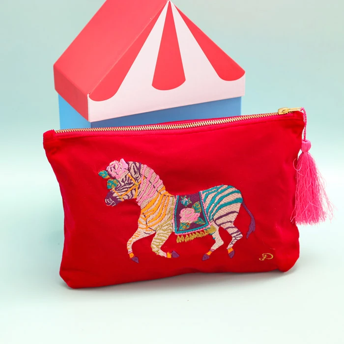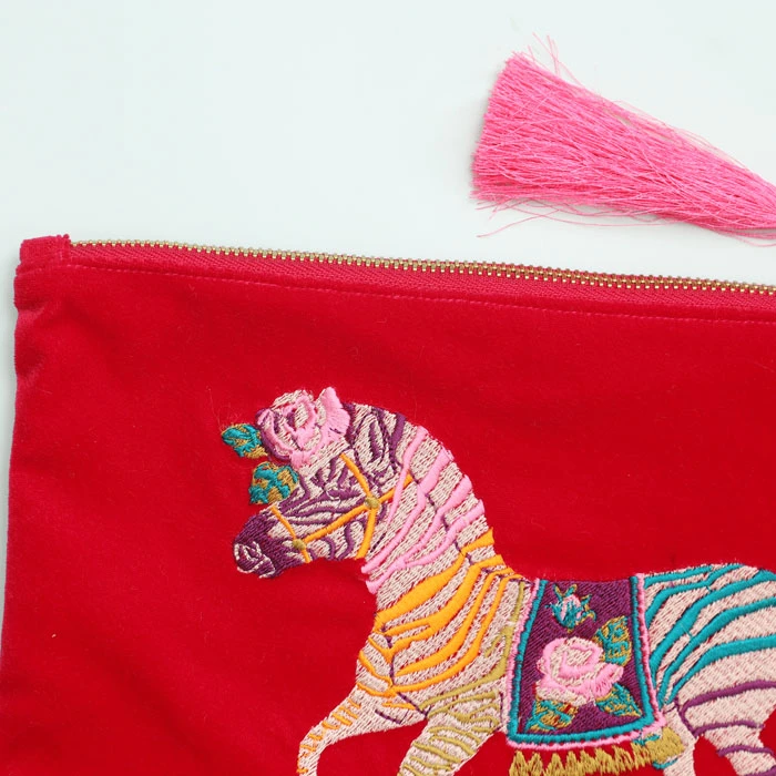 Pink Velvet Zebra Pouch – make a statement with this fabulous colourful large bag. The playful embroidered zebra is a colourful design of orange, pink, teal, green and wine. The Zebra pouch has a bright pink tassel against a deep pink velvet, with a gold zip.