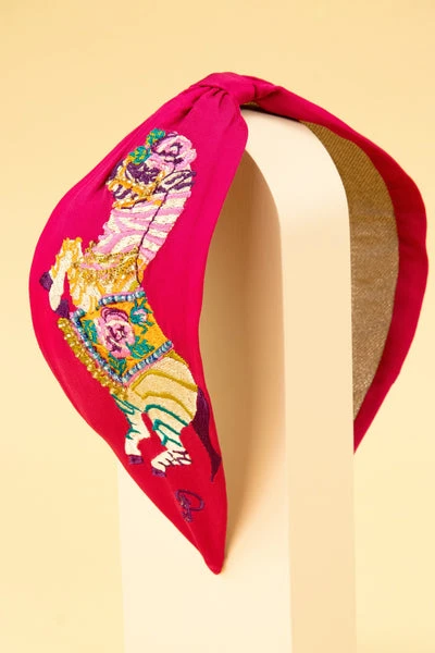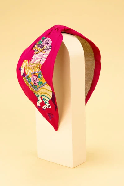 Powder zebra canival embroidered poppy red headband. Satin fabric covered headband with embroidered zebra design in shades of pink and gold featuring sequins and beads. Gathered at the centre. Width 8cm, height 16cm. 100% modal. Complimentary Gift Packaging Included.